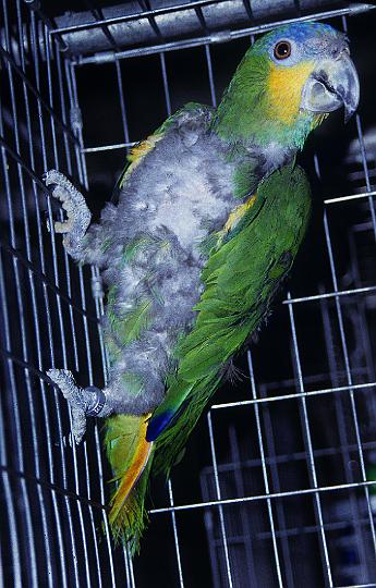 | Orange-winged Amazon parrots often exhibit inappropriate behavior, some of which is very similar to compulsive behaviors in people. This parrot has lost many of its feathers by constantly picking at them. (Photo courtesy of Cheryl Meehan, University of California at Davis) | |